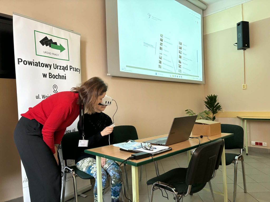 We wtorek 25 listopada 2025 roku w ramach porozumienia Warsztatu Terapii Zajęciowej z Powiatowy Urząd Pracy w Bochni odbyło się czwarte spotkanie. Tym razem to my odwiedzaliśmy PUP. Mieliśmy okazję „zanurzyć” się w wirtualnym świecie zawodów przy użyciu nowoczesnego narzędzia, jakim są okulary VR i tym samym zwiększyć świadomość na temat predyspozycji, kompetencji i zadań zawodowych. Wszyscy z wielkim zainteresowaniem i zaangażowaniem skorzystali z możliwości przetestowania nowego narzędzia. Dodatkowo pani Agnieszka Skoczek – doradca zawodowy z PUP w Bochni, nasz opiekun – oprowadziła nas po urzędzie.